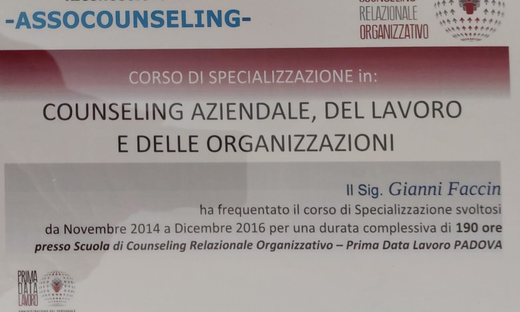 La certificazione professionale, che spesso ha cambiato denominazione, si definisce oggi certificazione di qualità. Da parte mia è una documentazione che possiedo e aggiorno dal 2014, anno di conseguimento del diploma di counselling. Non mi è mai stata richiesta. Per la prima volta ho provveduto a pubblicarla quest'anno, qui nel mio sito professionale. In modo che possa potenzialmente essere fruibile da chi fosse interessato. Anzi no, primariamente l'ho pubblicata perché amo questa professione. In questa uscita del blog pubblico sempre in ambito "counselling" la certificazione, in tal caso di partecipazione, riguardante la specializzazione realizzata in uno dei settori più difficili e fragili: aziende - organizzazioni - mondo del lavoro.