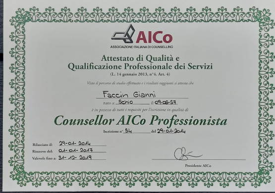 Counsellor Professionista iscritto all’albo regionale AICounselling Veneto n. 54 del 19/1/2014 ai sensi della L. 14 gennaio 2013, n. 4.